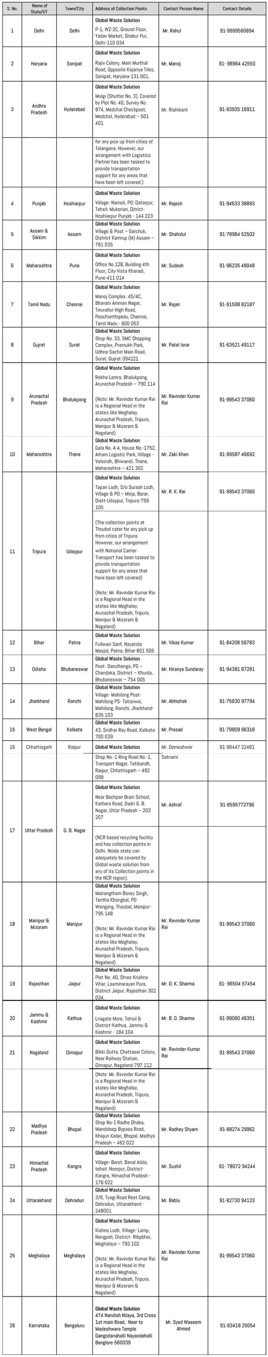 We have sign an agreement with M/s. GLOBAL WASTE SOLUTION, who are an authorized dismantler and recycler having authorization from Haryana Pollution control board as our new Recycler, who shall be responsible for all the EPR activities including collection transportation storage, segregation and dismantling and recycling with regards to our E Waste. We will use our recycler Partner’s collection points for channelization of the e-waste. We don’t have collection points in all the states but the collection points of neighboring state will collect the e -waste from nearby States. States wise list of collection points are given below: